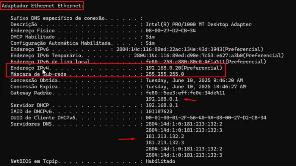 Este comando mostrará, além do IP de todas suas interfaces de rede, também o Gateway, DNS e outras informações.
