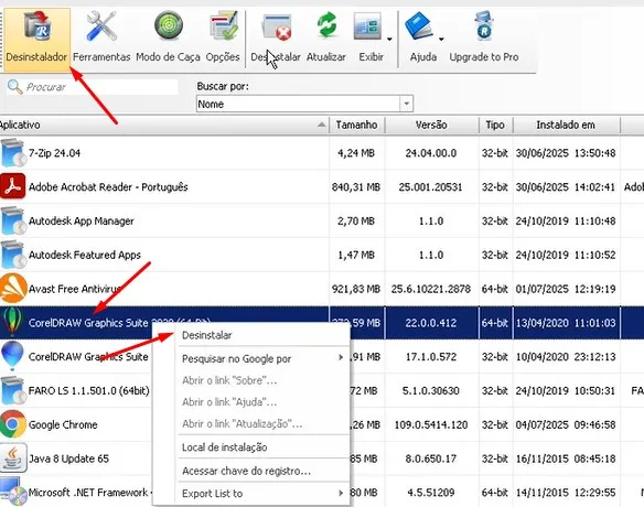 Ou selecione o programa e clique em “Desinstalador” no menu superior.