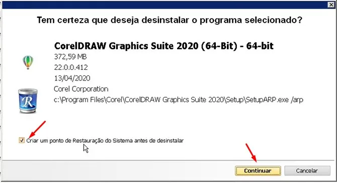 Inclusive sugere “Criar um ponto de restauração do sistema antes de desinstalar”.