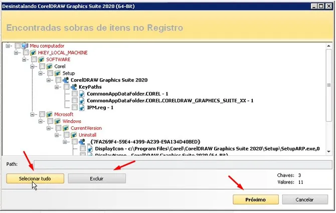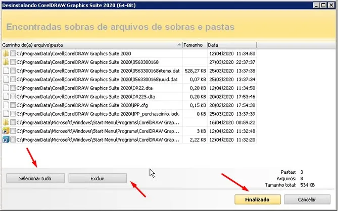 Em seguida informa “Encontradas sobras de arquivos e sobras e pastas”.