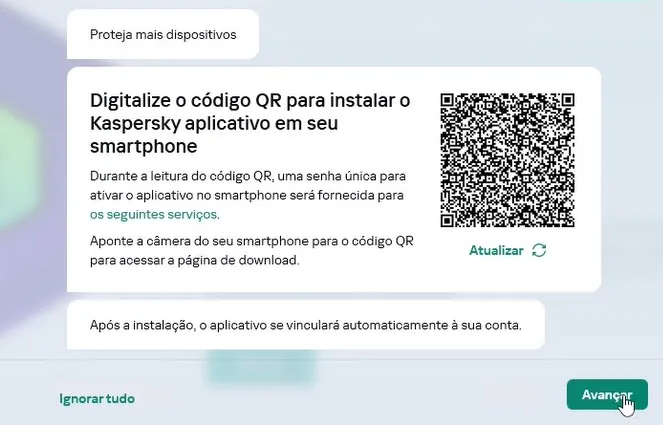 Na tela abaixo mostra um QR Code para apontar a câmera do celular e instalar o Kaspersky no smartphone.