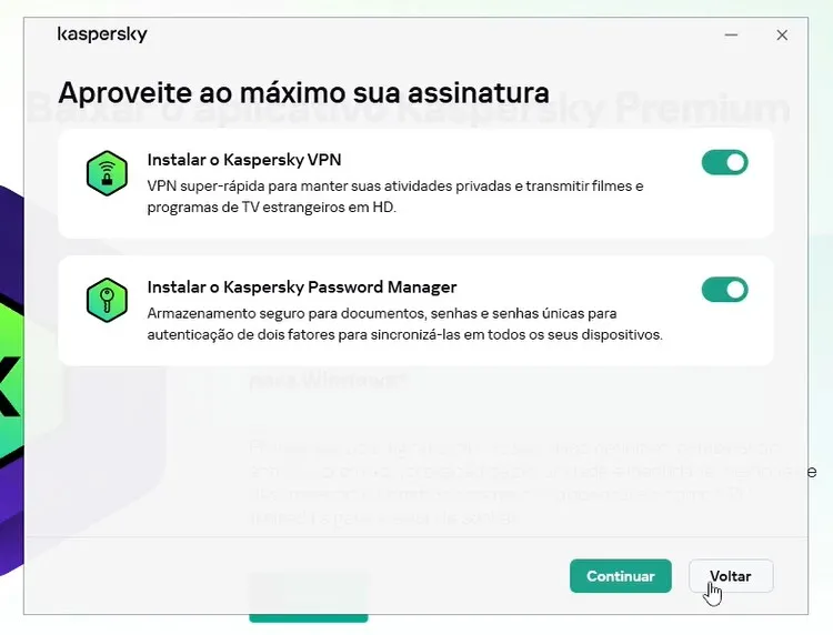 Aqui ele te fala da VPN e do Password Manager, pode deixar ambos ativos e clicar em continuar.