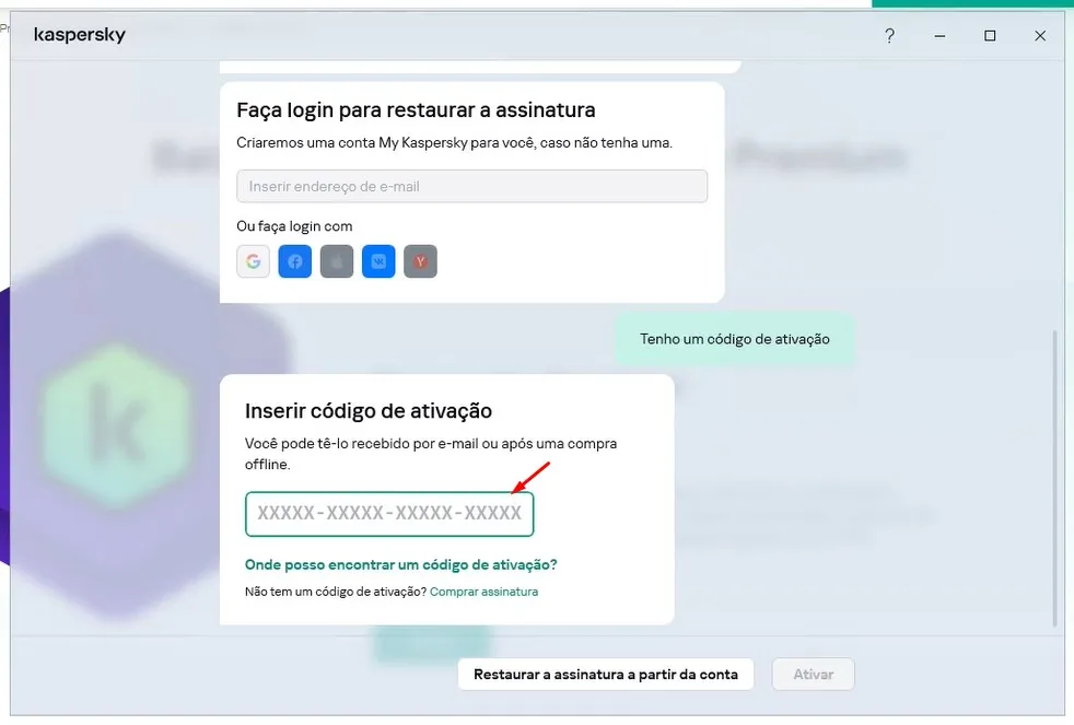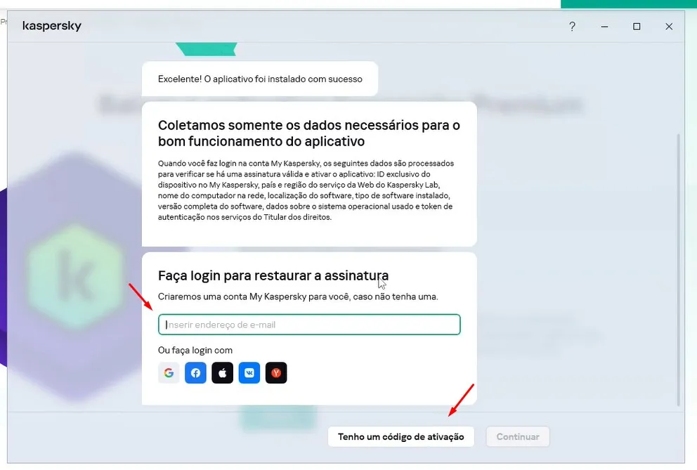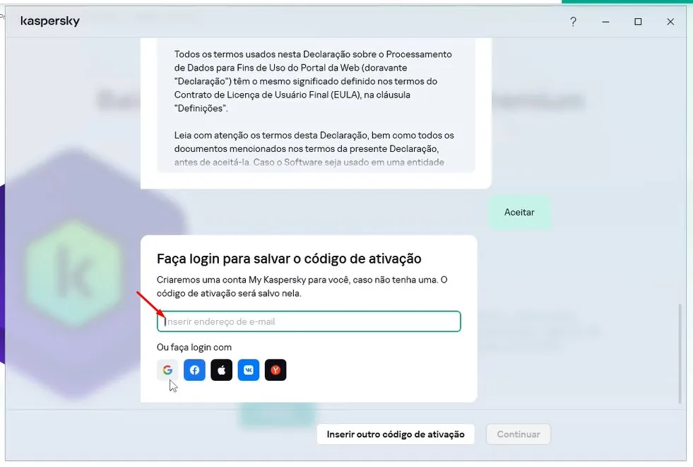 A seguir pede seu e-mail, se você já tiver uma conta da Kaspersky.